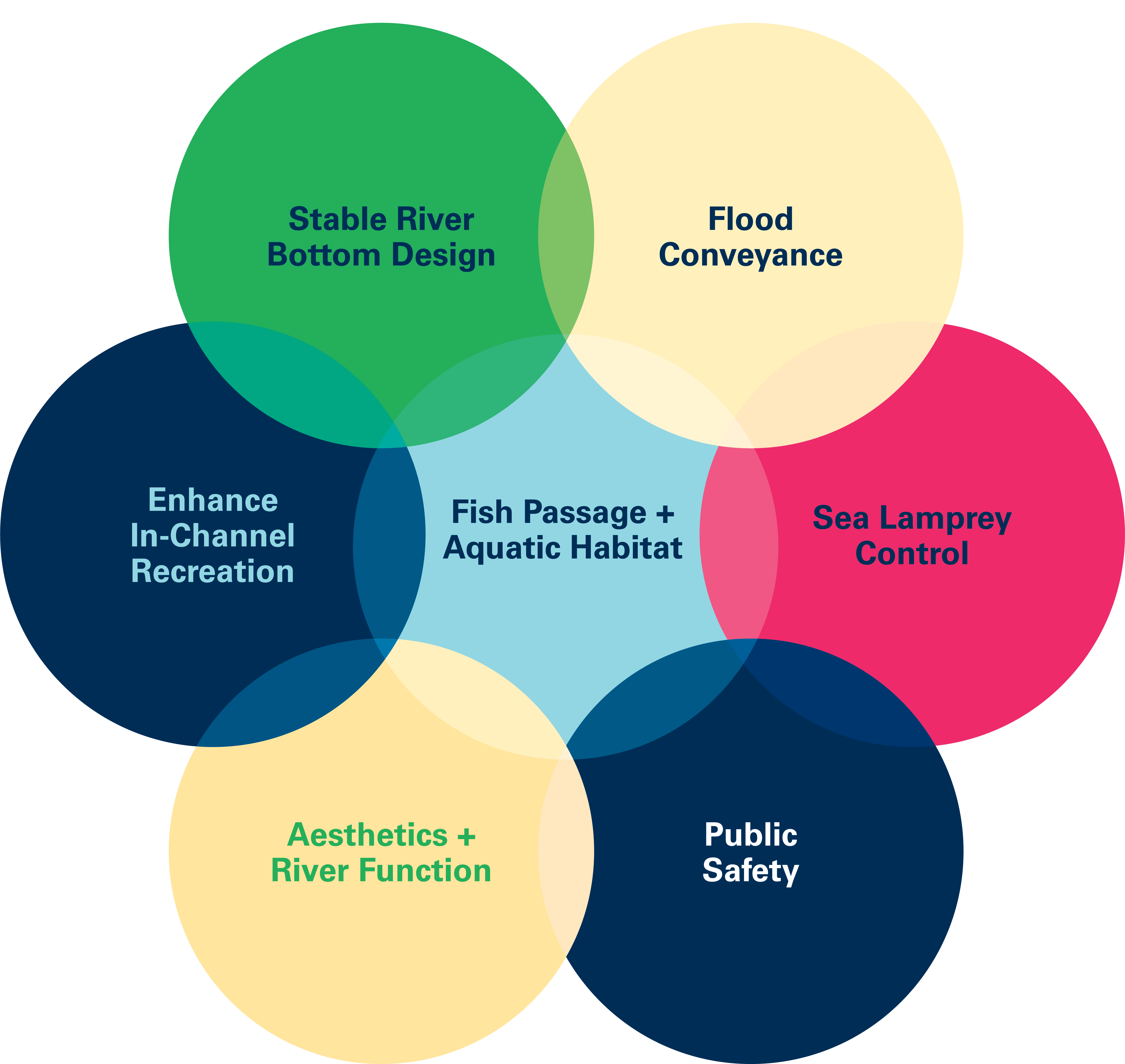 This project represents a collaboration between a number of public and private entities. Grand Rapids Whitewater (GRWW) is the nonprofit 501 (c) 3 organization that spearheaded the vision to bring the rapids back to the Grand River. They have retained the engineering firm responsible for the design and hydraulic modeling, numerous environmental and ecological consultants, and have secured funding for portions of the project. GRWW is collaborating closely with the City of Grand Rapids, who owns the dams in the river, to implement this project.